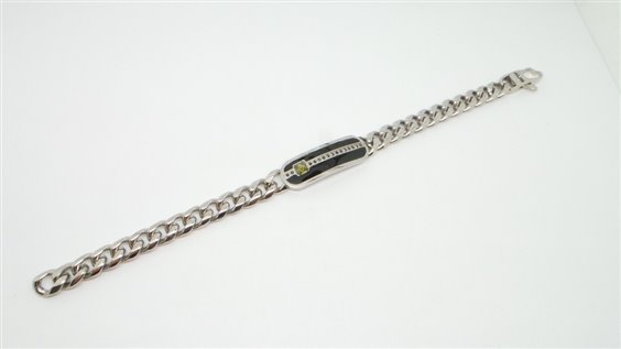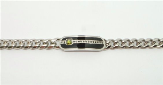 bracciale in acciaio a maglia groumetta larghezza mm 8,4 con pastrina nera centrale misura mm 11 x 36 al centro riga di zirconi neri e pietra peridotto , sotto parte lucida dove possibile personalizzazione , possibilitaì di messa a misura polso . tutto con certificato di originalita'.