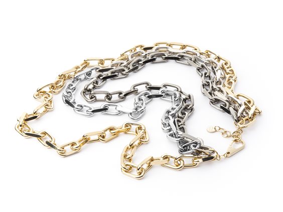 Collana a tre catene color brunito, argento e oro giallo. Lunghezza prima catena: 68 cm. Lunghezza seconda catena: 83 cm. Lunghezza terza catena: 100 cm + 5 cm di riduzione.