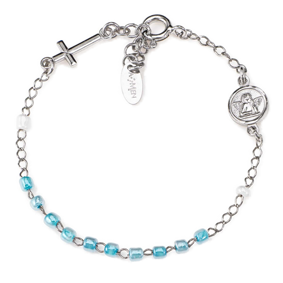 Bracciale Da Bambino Di Amen. Bracciale Rosario Junior In Argento 925 Con Cristalli Azzurri. Colore: Rodio. Lunhgezza: 14,5 Cm + 2.5 Cm Di Allungo Regolabile.