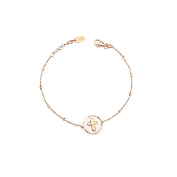 Bracciale Argento 925 Unisex Di Amen Della Collezione Le Madreperle. Bracciale Croce In Argento 925 Con Madreperla Bianca Di Colore Rosè. Materiale: Argento 925.