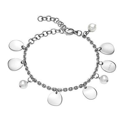 Bracciale in acciaio lucido con charms: pendenti in acciaio lucido liscio e pele sintetiche bianche. Chiusura a moschettone. Lunghezza regolabile da cm 15 a cm 20.5.