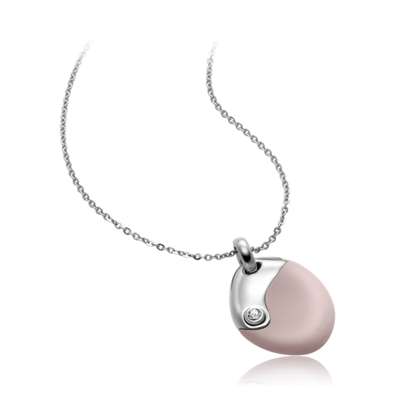 Collana in acciaio lucido, lunghezza regolabile: 50-60cm, chiusura con moschettone. Pendente in acciaio lucido con inserto soft touch color rosa con cristallo bianco.
