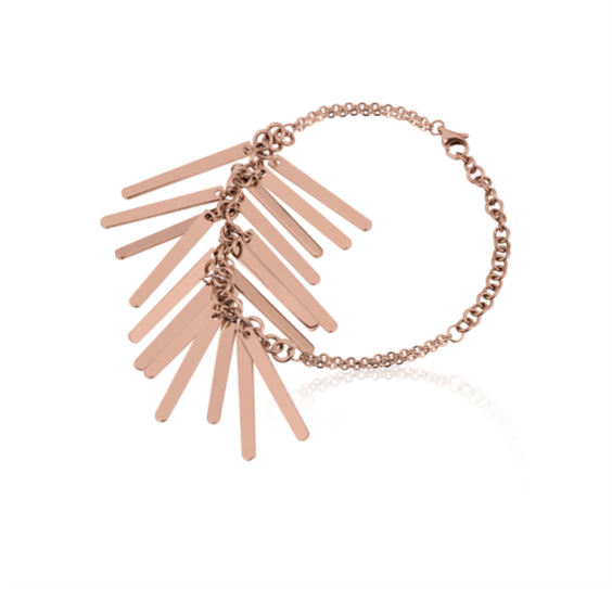 In acciaio lucido con trattamento IP oro rosa ed elementi rettangolari. Catena in acciaio lucido con trattamento IP oro rosa.