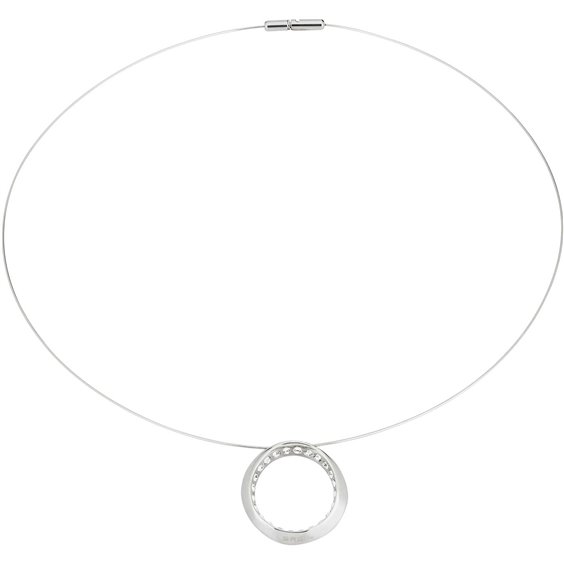 In acciaio lucido con elemento centrale bilux con cristalli bianchi. Cavetto rigido in filo d'acciaio e chiusura a binario.
