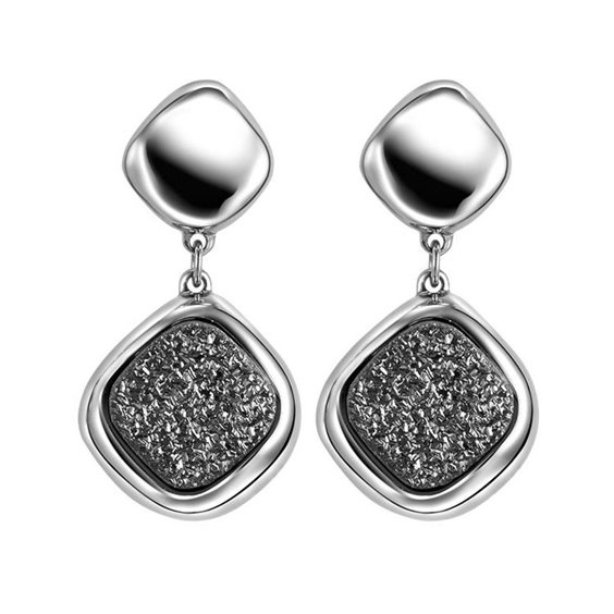 Orecchini pendenti in acciaio lucido con particolare nero. Chiusura con paletto e farfallina in acciaio lucido. Lunghezza totale cm 2,5.