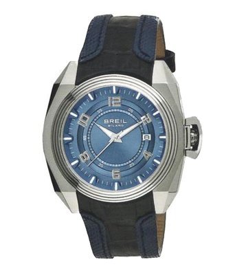 Orologio Breil da uomo della collezione Mito, cassa in acciaio lucido e satinato, cinturino in pelle nera e tessuto tecnico blu. Movimento al quarzo, vetro zaffiro, resistente all'acqua fino a 100 mt.
