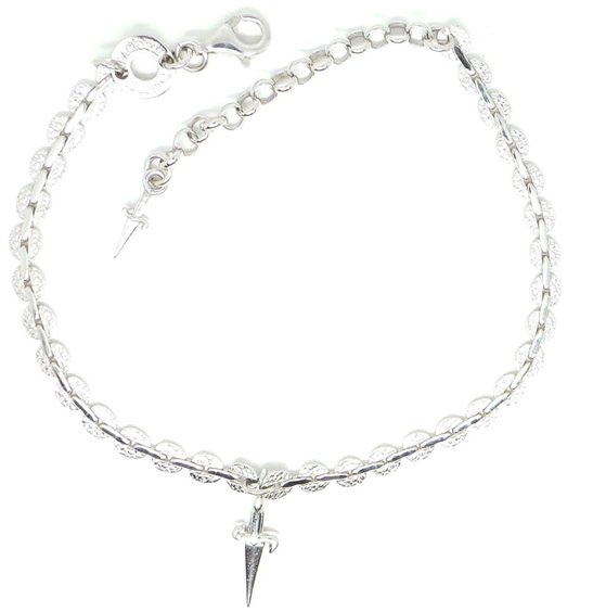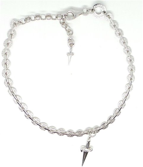 BRACCIALE UNISEX LINEA CESARE PACIOTTI ARGENTO 925/°°° MAGLIA FANTASIA GODRONATA A CERCHIETTI ø3,83, AL CENTRO PENDENTINO A PUGNALE CM 1,9, LUNGHEZZA TOTALE CM 21 CON POSSIBILITA' DI ESSERE AGGANCIATO PIU' STRETTO A SECONDA DEL POLSO, CHIUSURA A PAPPAGALLO, PESO GRAMMI 4,5