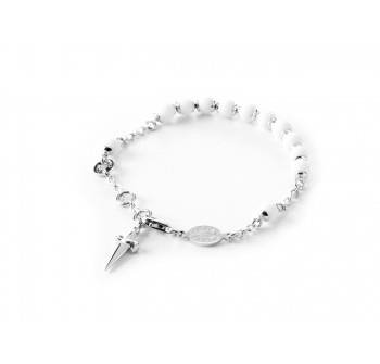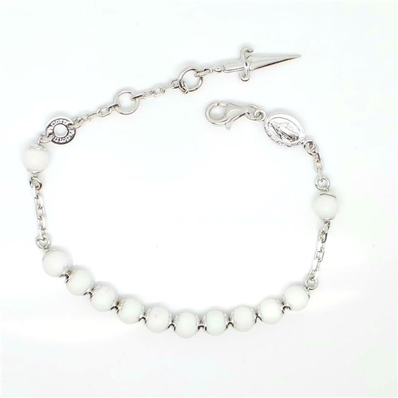 bracciale argento con catenina rolo' infilate 12 sferette in pietra dura ( agata bianca) tutte fissate di ø 6mm opache. medaglia sacra vicinino al terminale. misura 23 cm con possibilita' di riduzione