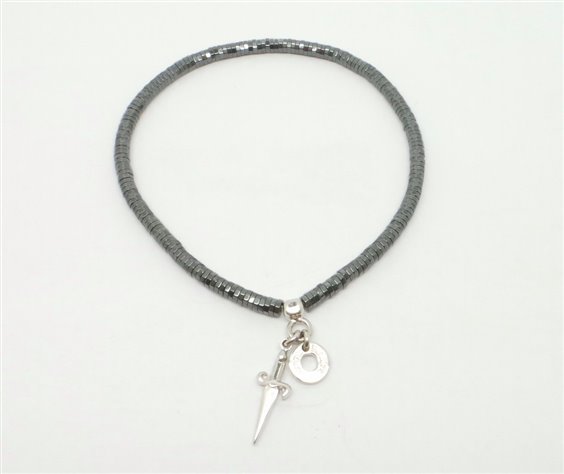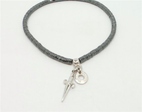bracciale Cesare Paciotti adatto a chi segue la moda e cerca un gioiello da indossare tutti i giorni.Il bracciale Paciotti elasticizzato formato da sferette di EMATITE è personalizzato col celebre pugnale nel centro del bracciale di cm 1.6 ,diametro 6 cm . tutto con certificato di garanzia