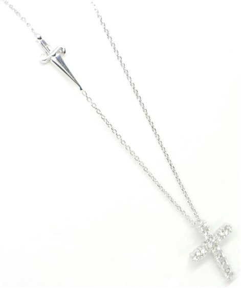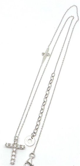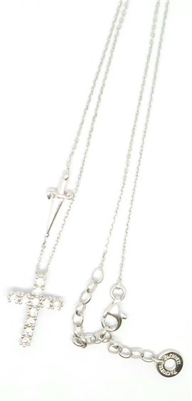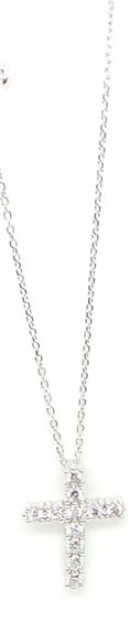 COLLANA DONNA IN ARGENTO RODIATO 925, CATENINA ROLO' SPESSA MM 1 CON PENDENTE A FORMA DI CROCE LUNGA CM 1,9 CON INCASTONATI ZIRCONI BIANCHI E SPADINA SULLA CATENINA. LUNGHEZZA TOTALE 49 CM CON POSSIBILITA' DI ESSERE AGGANCIATA PIU' CORTA. PESO GRAMMI 4. CHIUSURA A MOSCHETTONE CON LOGO.