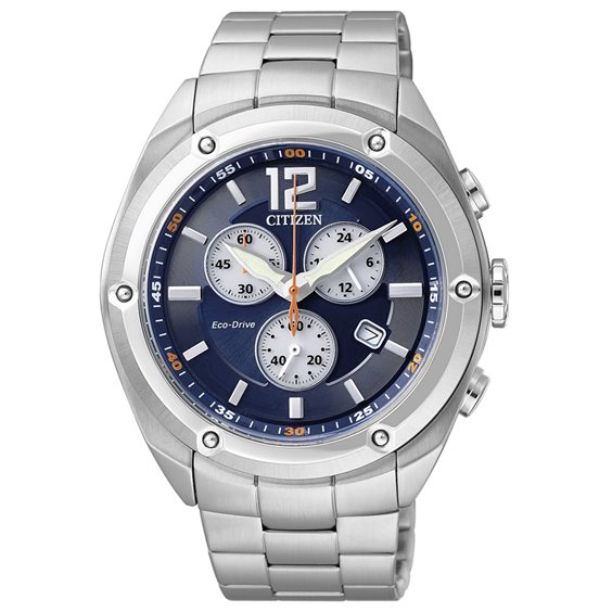 Orologio con cassa in acciaio, diametro 42mm, fondo serrato a vite. Quadrante blu con vetro minerale. Cronografo. Movimento Eco Drive ( a carica luce infinita). Impermeabilità 10 BAR.