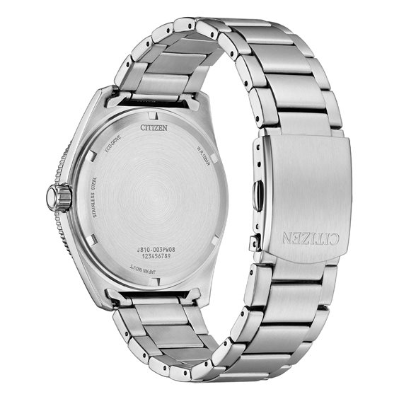 AW1888-53E – Orologio Citizen Marine 188 della collezione OF Movimento Eco Drive J810 con riserva di carica di 8 mesi. Funzioni Calendario. WR 10 bar. Caratteristiche Cassa in acciaio, spessore 12,4 mm, con fondello a vite. Lunetta fissa in acciaio con anello in alluminio. Bracciale in acciaio con chiusura a doppio pulsante. Vetro minerale con lente di ingrandimento nella finestrella della data. Lancette e indici luminosi.