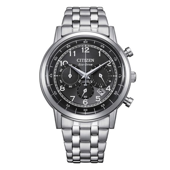 Orologio Cronografo Uomo Collezione OF. Cassa acciaio inox lucido. Fondo serrato a vite. Movimento al quarzo Eco-Drive a carica luce con riserva di carica di 270 giorni con funzione di cronografo a 1/5 di secondo fino a 60 minuti. Quadrante nero cifre arabe bianche lancette lucide. Vetro minerale leggermente bombato. Bracciale regolabile in acciaio lucido e spazzolato, chiusura deployante con pulsanti. Impermeabile 10 bar (10 atm). Scatola e Libretto Istruzioni Originali. Garanzia 5 anni.