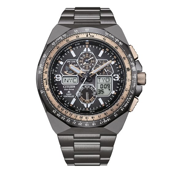 Orologio Analogico-Digitale Multifunzioni uomo Radiocontrollato modello AIR Promaster 35 Anniversary. Cassa in acciaio grey opaco con particolari lucidi, lunetta interna fissa e placcata oro rosa , esterna girevole bidirezionale grey, pulsanti crono di forma e corona placcati oro rosa. Movimento Eco-Drive (a carica luce) con riserva di carica di 6 mesi ed indicatore livello di carica sul quadrante. Funzioni: Radiocontrollato a 5 canali: ricezione del segnale orario USA, Europa, Cina e Giappone. World timer con orario di 43 città del mondo e ora GMT. Doppio allarme. Crono a 1/100 di sec. fino a 24 ore. Countdown a partire da 99 minuti. Calendario perpetuo. Funzione di illuminazione display digitali. Quadrante colore nero indici e lancette luminose. Vetro zaffiro. Bracciale regolabile in acciaio grey chiusura deployante con pulsanti. Impermeabile 20 atmosfere.