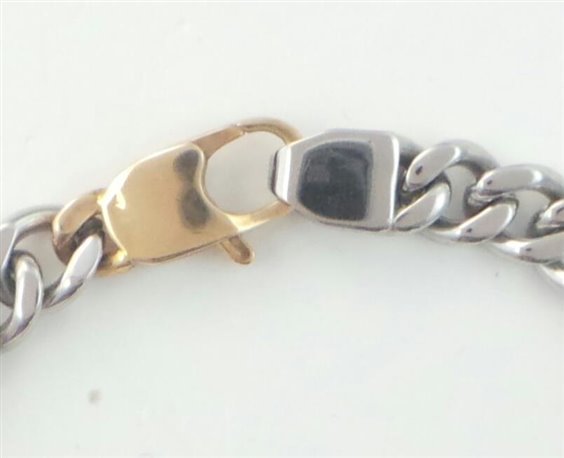 Bracciale di carattere Comete da uomo, maglia groumette larga con due targhette centrali snodate, con placcatura in oro giallo e smalto nero. Lunghezza massima maglia 0,8 cm, larghezza massima targa 1,3 cm. Chiusura a moschettone placcato oro gilallo.