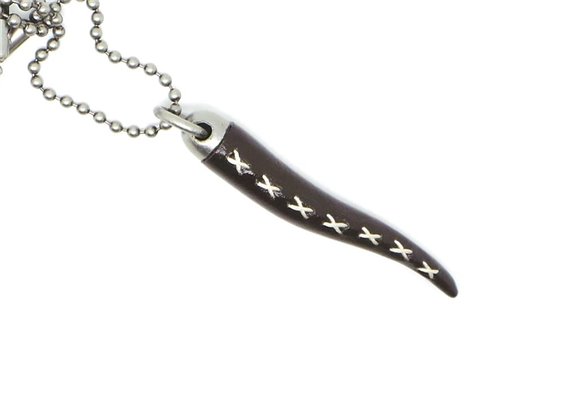 Collana donna D&G con pendente. Collana in acciaio e cuoio. Pendente lungo 7 cm. c.a. è in cuoio rifinito con cuciture bianche. Chiusura a moschettone personalizzata D&G. In chiusura piastrina marchiata D&G. Lunghezza con pendente 38 cm c.a.