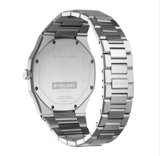 Orologio D1 Milano in acciaio spazzolato. Orologio D1 Milano con cinturino in acciaio e quadrante acciaio. Misura cassa 40mm X 6,20mm. Materiale cassa acciaio inossidabile 316L, spazzolato e lucidato. Chiusura con farfalla nascosta. Vetro zaffiro antiriflesso. Movimento Citizen Miyota 1L22, al quarzo. 5 ATM. Garanzia 2 anni.