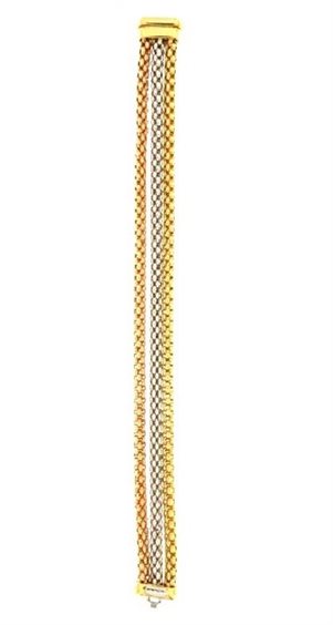 Bracciale a tre fili in oro giallo, bianco e rosa 18 kt. Chiusura a barra con sicurezza. gioiello autentico del marchio FOPE, realizzato in italia.
