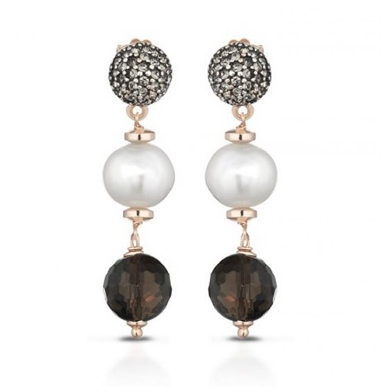 Paio orecc. in AG925 rosa, quarzo, p. FW, ema. rosa e met. brun. e crist.