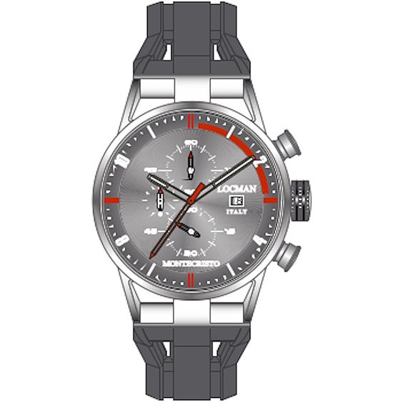 Orologio Cronografo Da Uomo Di Locman Della Collezione Montecristo. Orologio Con Cassa In Acciaio E Titanio Della Dimensione Di 44 Mm Con Numeri Arabi Stampati. Cinturino In Silicone Grigio Di Larghezza: 25Mm. Orologio Con Resistenza All'Acqua Di 10Atm E Movimento Cronografo.