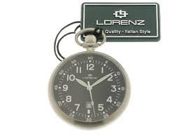 OROLOGIO LORENZ DA TASCA SOLO TEMPO QUARZO CON DATARIO ORE 6, CASSA IN ACCIAIO SATINATO E VETRO MINERALE, QUADRANTE NERO OPACO CON NUMERI ARABI BIANCHI E LANCETTE BIANCHE TRATTAMENTO FLUORESCENTE; CORONA ZIGRINATA E ANELLO PER CATENA IN ACCIAIO SATINATO, FONDELLO A PRESSIONE IN ACCIAIO SATINATO. DIMENSIONI CASSA DIAMETRO 47,30mm X SPESSORE 10,50mm. GARANZIA 2 ANNI. REFERENZA 025215AA