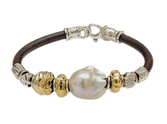 Bracciali in cuoio 5 mm con elementi in oro lavorato a mano, argento e perla barocca.