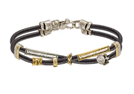 Bracciali doppio filo in cuoio 3 mm con elementi in oro lavorato a mano e argento.