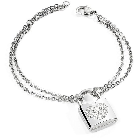 Bracciale lungo 20,00 cm. in acciao lucido con doppia catena e ciondolo centrale a forma di lucchetto. Nel lucchetto vi sono zirconi a formare un cuore, perfetto per un regalo alle persone a noi più vicine