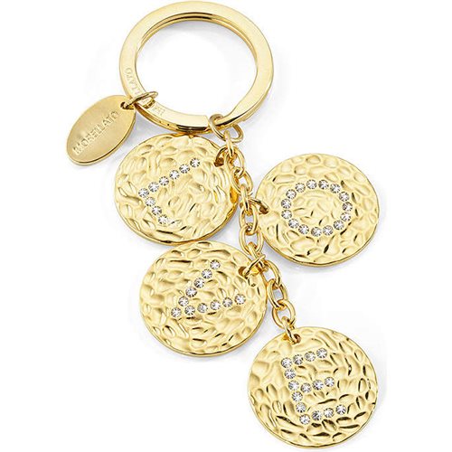 Portachiavi donna in acciaio 316L , PVD oro giallo , lunghezza totale cm 11 , 4 monete diametro cm 2.5 , cristalli bianchi che formano la scritta love.