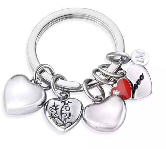 Portachiavi donna in acciaio 316L , lunghezza totale cm 5 , charms pendenti a forma di cuore , smalto nero e rosso , cristallo bianco incassato .
