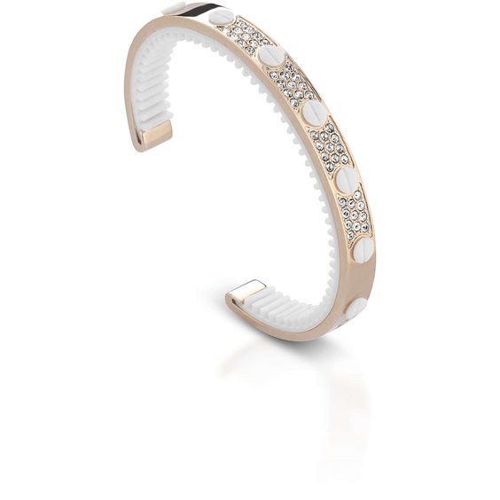 Bracciale Rigido In Acciaio Color Rosè E Dettagli In Silicone Di Colore Bianco Con Cristalli