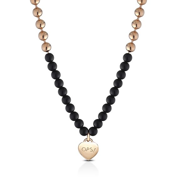Collana Da Donna Di Ops Objects Della Collezione Bubbles. Gioiello In Acciaio E Perle Di Colore Oro Rosa E Nero. Gioiello Con Sfere In Acciaio E Perle E Dettagli A Forma Di Cuore. Gioiello Della Lunghezza 450Mm E Pendente Cuore: 13Mm. Gioiello Con Chiusura A Scatto.