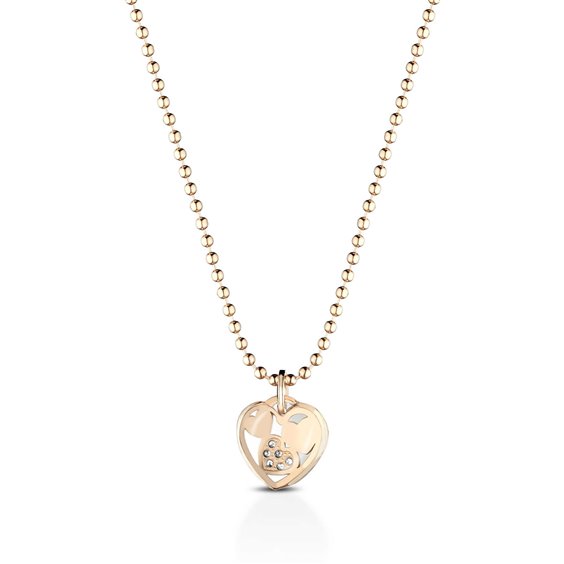 Collana donna con catena in acciaio a microsfere con pendente a cuore in metallo color oro rosa ricoperto in resina trasparente. Il pendente al suo interno presenta tre cuori di dimensioni differenti uniti tra loro, di cui uno impreziosito da cristalli. Collana con medaglietta in acciaio con logo OPS! con chiusura a moschettone.