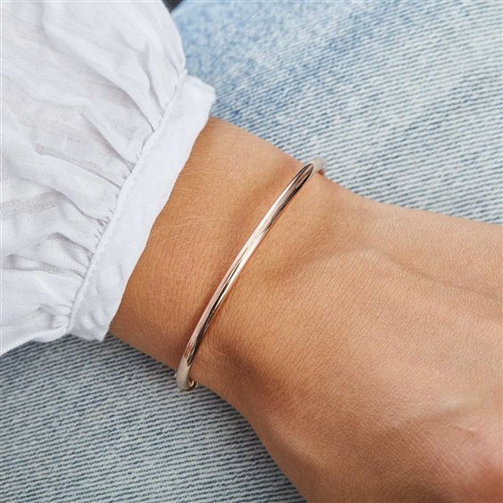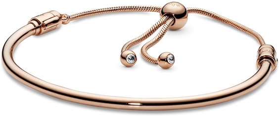 L’aspetto pulito e moderno del bracciale rigido incontra la modernità della chiusura scorrevole anche in Pandora Rose. Basta far scorrere la chiusura per creare una vestibilità perfetta. Pietre chiare danno un tocco scintillante alla chiusura. MISURA 1