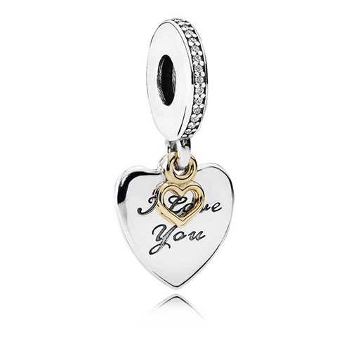 Charm pandora in argento con scritta 'i love you'.