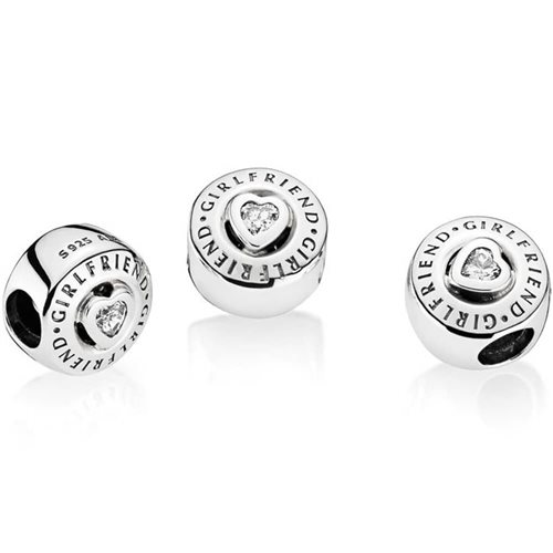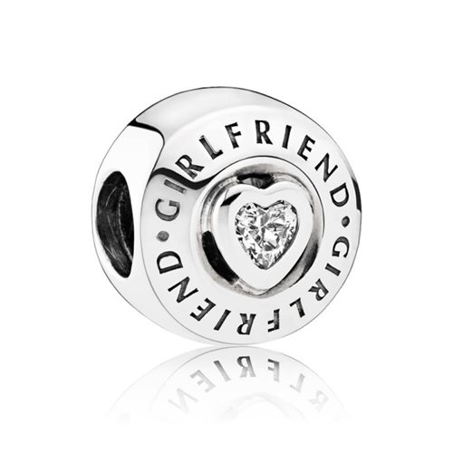 Charm pandora in argento e zircone con la scritta 'Girlfriend'.