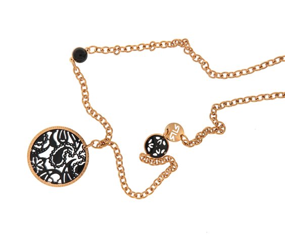 Collana Rosè, con pendente a goccia,internamente arricchito con disegni floreali. La pallina di 10 mm, e l'elemento nero di 18 mm, posti all'interno della catena, contribuiscono all' armonia di questa meravigliosa collana, richiamando il motivo e il colore presente nel pendente.