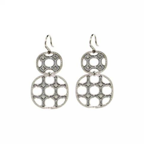 Orecchini in bronzo traforati con glam film, chiusura con paletto e farfallina a pressione.