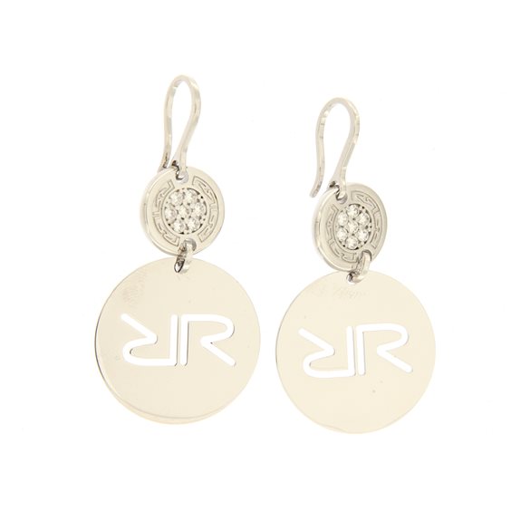 Orecchini in bronzo placcati oro bianco con zirconi, lunghezza totale 5 cm.