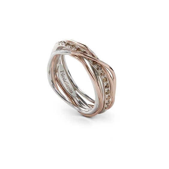 IL 7 rappresenta l’intuizione, la magia che si fonde con al realtà ed è il numero della perfezione ciclica associata al cerchio. Anello Filodellavita Classic Collection 7 fili in oro rosa 9kt e in Argento 925 arricchito al Palladio , ornato da una riviere di 16 diamanti brown / black taglio brillante da 0.21 kt. L’intreccio di due leghe, unite a mano da sapienti orafi, rende la fascia pulita, dalle linee morbide e dinamiche.