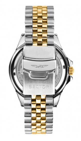 Orologio da uomo con movimento automatico Miyota 8205 e funzione di solo tempo con data. Cassa in acciaio inox dal diametro di 43 mm. Lunetta in alluminio con finitura dorata e nera. Quadrante analogico nero con indici applicati e datario a ore 3 con lente d'ingrandimento. Vetro zaffiro. Superluminova per una chiara visualizzazione anche al buio. Cinturino bicolore in acciaio anallergico silver e gold; chiusura deployante con pulsanti. Resistente all'acqua fino a 100 metri di profondità. Appartiene alla collezione 230 Automatic.