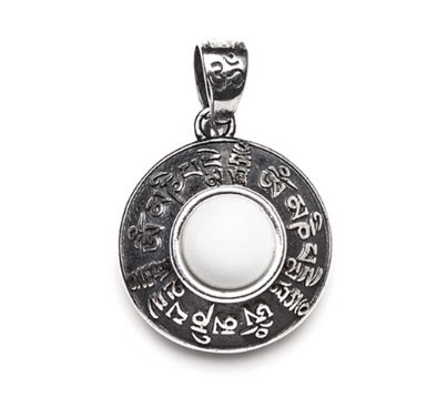 Ciondolo originale Tamashii RIG ZVA arricchito con pietra naturale AGATA BIANCA. Realizzato in Argento 925‰, riporta il mantra “Om Mani Padme Hūm” del Buddha della compassione Cenresig, tra i più noti e diffusi mantra del Buddhismo.Il diametro della pietra è di 10mm ed il ciondolo è munito di cordoncino in cotone (65cm) con chiusura originale Tamashii. Ogni ciondolo è spedito con relativa confezione originale e certificato di garanzia.