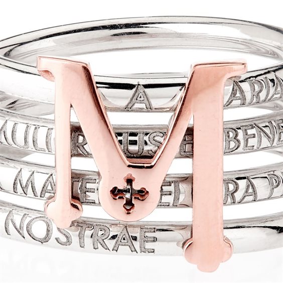 ANELLO TUAM X IN ARGENTO RODIATO E ORO ROSA 9KT Collezione TUAM X - Anello in Argento rodiato e Oro rosa con l’iconica M di TUUM Una spirale di parole che scorrono lungo la sua lunghezza. Un fiume di lettere che iniziano con Maria Gratia Plena. Al centro troneggia l’iconica M, l’omaggio di TUUM alle forze generatrici del mondo: M di Mater, M di Maria, M di Mondo. Un’armonia di linee morbide e sinuose che incontrano la solidità e la forza del capolettera creando un anello elegante, molto raffinato, in metalli nobili come l’argento e l’oro.