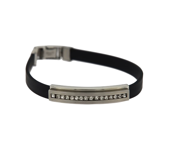 BRACCIALE UOMO IN CAUCIU' NERO CON PIASTRINA E CHIUSURA IN ACCIAIO E ZIRCONI