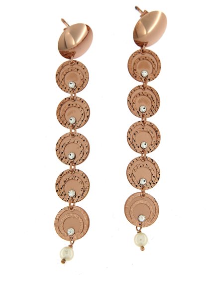 ORECCHINI CON CERCHI PENDENTI IN ARGENTO 925 COLOR ORO ROSA ARRICCHITI DA ZIROCONI CENTRALI E LAVORAZIONE EFFETTO DIAMANTATO CON PERLA IN FONDO AL PENDENTE
