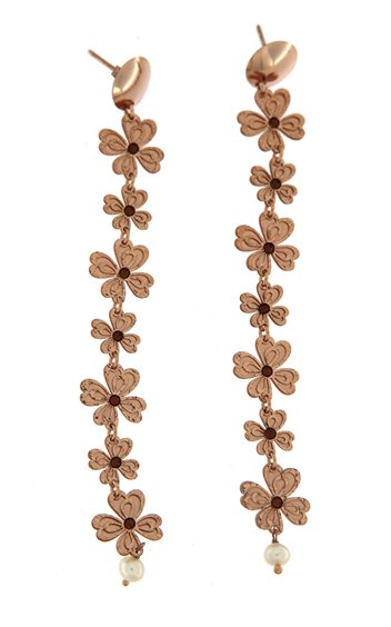 ORECCHINI CON FIORI PENDENTI IN ARGENTO 925 COLOR ORO ROSA ARRICCHITI DA ZIROCONI CENTRALI E LAVORAZIONE EFFETTO DIAMANTATO CON PERLA IN FONDO AL PENDENTE