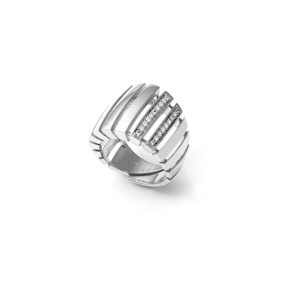 Anello in argento rodiato a fascia con dettaglio in pietre zirconia cubica bianca, disponibile nelle misure 12 e 16. Un anello eclettico ed elegante finemente realizzato in argento 925 ed impreziosito da scintillanti zirconi