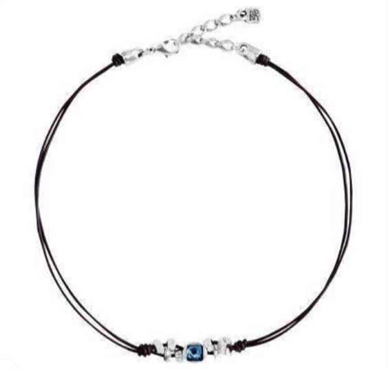 Collana in cuoio e acciaio rivestito in argento con cristallo centrale blu. Disponibile con scatola e garanzia originale.