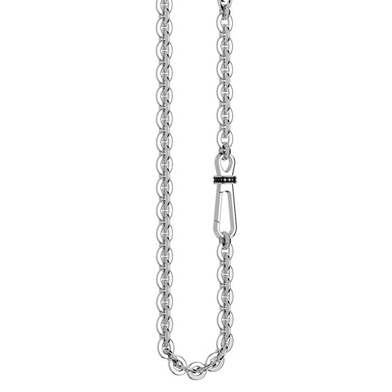 Collana da uomo in Argento 925 caratterizzata da una maglia rollò ed una particolare chiusura a moschettone impreziosita da spinelli neri incastonati. Misura 50 cm. Il gioiello è completamente realizzato a mano in Italia.